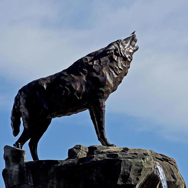 高品质户外装饰 景观动物 狼雕塑 描述: 高品质户外装饰 景观动物 狼雕塑。该雕塑采用多种材料精心手工制作而成,展现出狼的复杂细节和栩栩如生的品质。